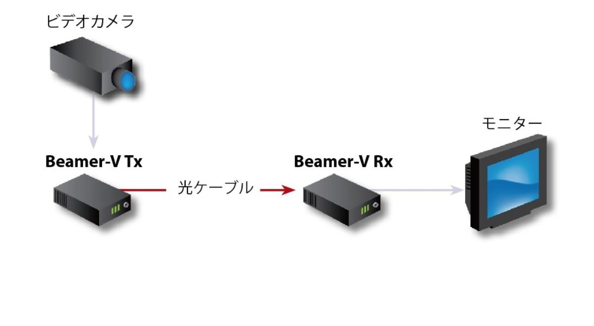 Beamer-V は、コンポジットを光伝送するシンプルでローコストなシステムです。8MHzのビデオ帯域で、マルチモード光ケーブルを通して850nmの波長で3Kmまで伝送します。 Beamer-V は、セキュリティー、大切なA/Vアプリケーションに最適です。