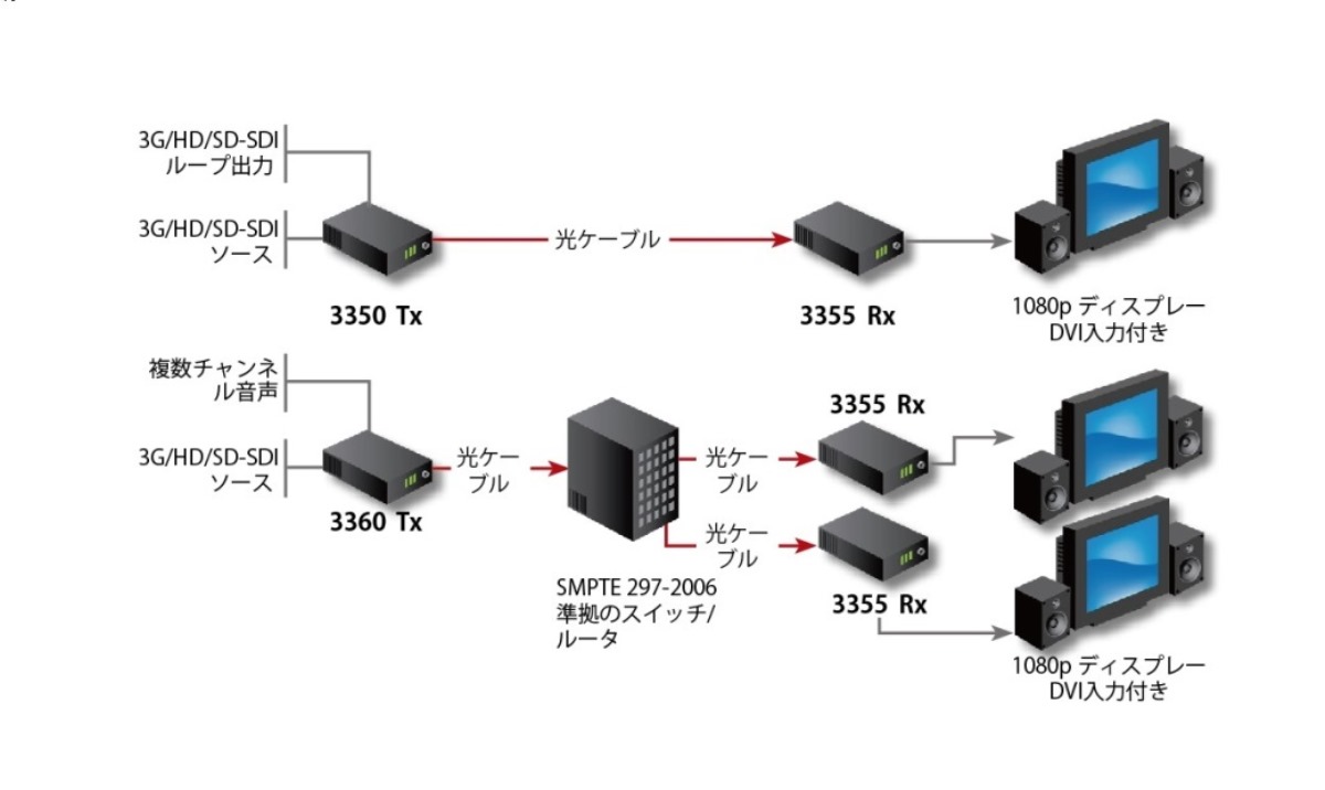 FiberLink 3350シリーズ は、DVB-ASI のみならず、SMPTE 424M-2006、262、259 準拠の 3G/HD/SD-SDI 信 号をエンベディドオーディオ、データ付き、それぞれ無しで、シングルモードまたはマルチモード光ケーブル1本で伝送しま す。信号は光伝送の前に補償リクロックされます。3350送信機は、SDI信号をリクロック補償し、SDIループスルーを装備し、3351受信機は2系統 のリクロック補償された出力を提供します。