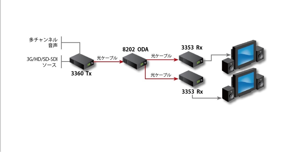 FiberLink® 8200ははポイントツーポイント分配用のハブ、光延長用のリピーター、マルチモードとシングルモードのアクティブリピートのインターフェースとして使用できます。また、FiberLink® Matrixと接続して複雑な信号スイッチングと信号分配にも使えます。FiberLink® 8200はCWDM対応の出力波長を使うとき、FlexPDO、CWDMとの接続がが可能です。.