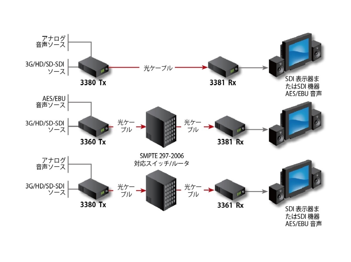 3380シリーズは SMPTE 297-2006 に準拠し、他のFiberLink 3G/HD/SD-SDI製品や他社のSMPTE 297-2006光ファイパー準拠装置とシームレスに運用できます。