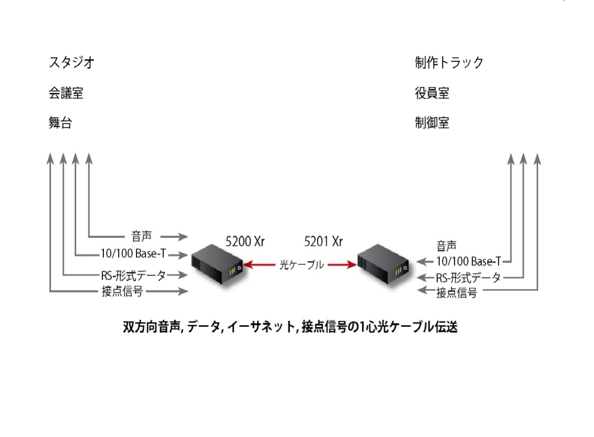 Fiberlink 5200 シリーズは、シングルモードまたはマルチモードの光ファイバケーブル 1 本で双方向音声、RS タイプデータ、10/100 Base-T イーサネット、コンタクトクロージャーを伝送します。すべてのチャネルは独立しており、同時に利用可能で、1 つの製品で比類のない柔軟性を提供します。オーディオおよびイーサネット用に今日展開し、明日にはオーディオ、RS-Type データ、イーサネット、およびコンタクト・クロージャ用に再展開します。 すべての信号は双方向で、シングルモードファイバーを使用した場合、30kmという驚異的な距離を移動します。もちろん、50u と 62.5u のマルチモード・ファイバーを使用して、それぞれ 1km と 0.8km の驚くべき距離を移動することもできます Fiberlink 5200シリーズは、安定した予測可能な長期的な性能を提供するように設計されています。 Fiberlink 5200は、最も一般的なRSフォーマットをサポートしています。RS-232、RS-422、RS-485 4線式または2線式です。 Fiberlink 5200シリーズを使用することができるアプリケーションは無限大ですが、それは放送や企業のスタジオ、OBバン、ポイント-オブ-ビュー-カメラ、レンタル&ステージング、講堂、スタジアムや劇場、空港や交通機関のハブ、遠隔教育、手術や医療イメージングなどに最適です
